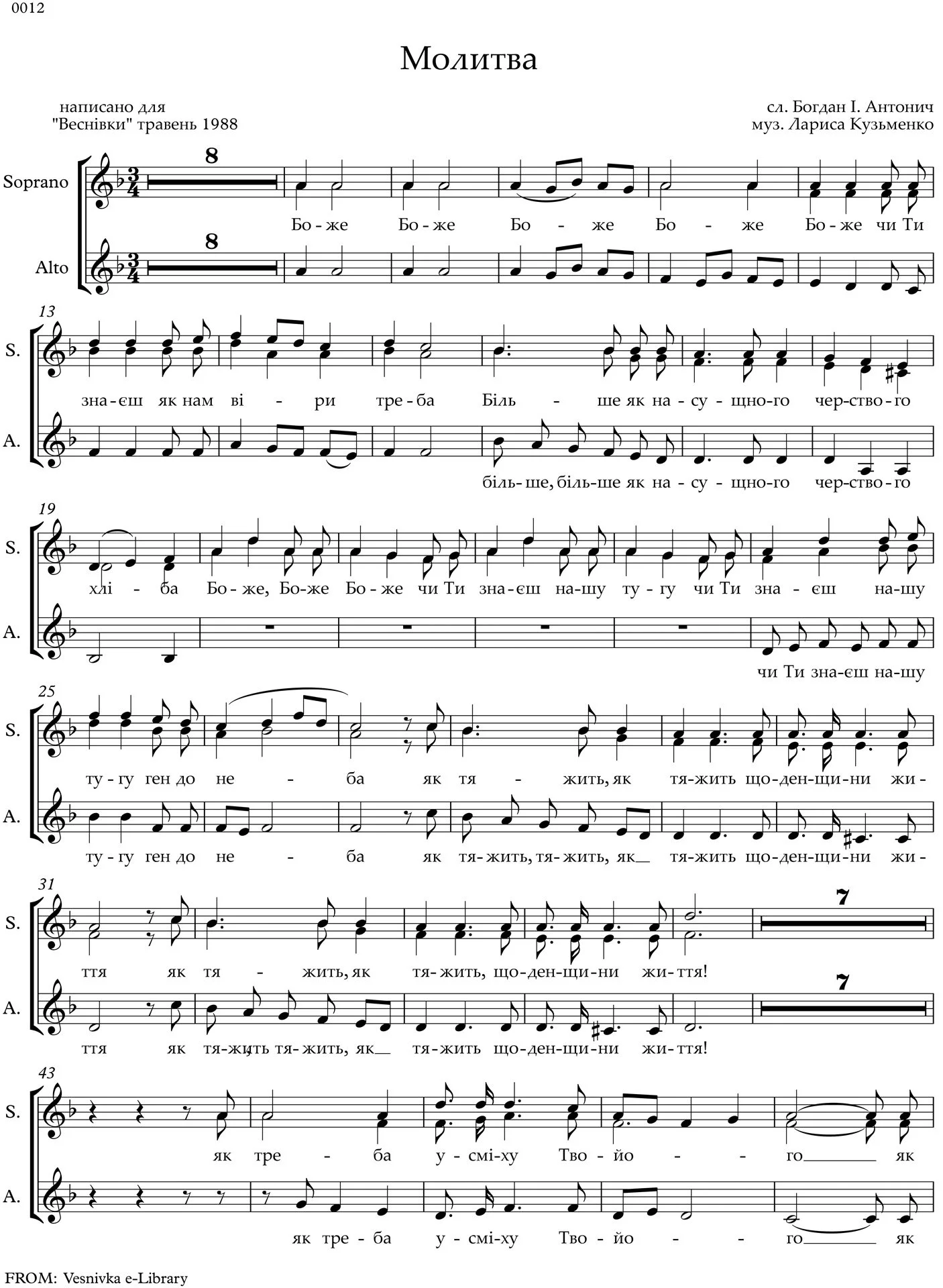 With text taken from the poetry of Bohdan Antonych, Toronto-based Canadian composer Larysa Kuzmenko wrote this prayer of supplication espousing the necessity of keeping one's faith in God. Kuzmenko (born 1956) is a Juno Awards-nominated Ukrainian Canadian composer and pianist based in Toronto, Canada. Many of her works have been published by Boosey & Hawkes.
