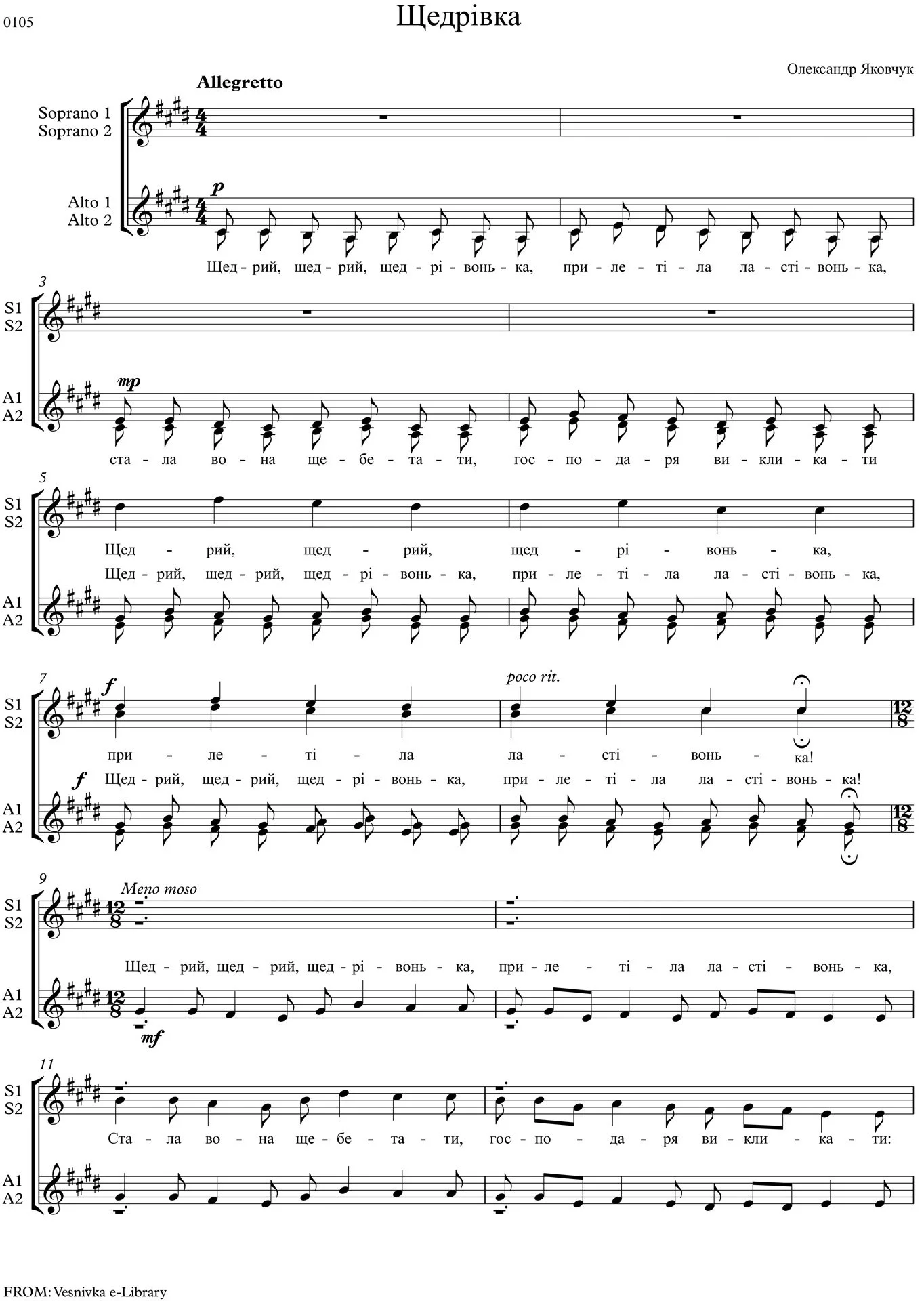 In this New Year’s song, a swallow arrives and calls to the Master of the House to come view the bounty of his fields and livestock and to appreciate his beautiful black-browed wife. Ukrainian Christmas traditions reflect achievements of an ancient culture, impressive in the musical and contextual diversity of its songs and in the number of its carols and epiphany carols. There are two distinct groups of Ukrainian Christmas music. Koljadky (Ukrainian Christmas Carols) are sung in church alongside traditional liturgical texts and hymns from Christmas Eve (January 6, according to the Julian Calendar) to Epiphany (January 19). Shchedrivky (New Year’s songs), being much older and having pagan roots, are rarely sung in a liturgical setting, given their secular themes of bounty and prosperity. These delightful and festive new-year folk songs of felicitation, with their charming and rhythmic melodies, reflect sectarian life and express wishes for health, happiness and bountiful harvests.
