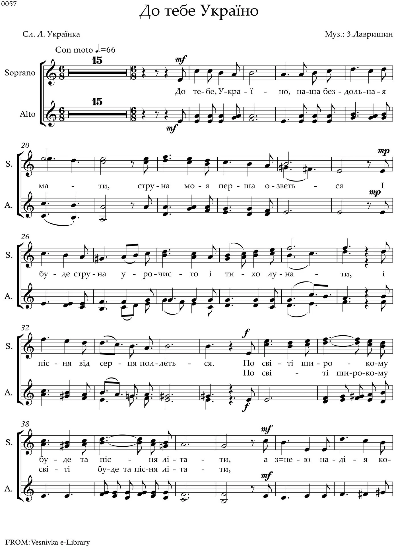 This classical song is set to poetry by Lesia Ukrainka. Vesnivka commissioned Zenoby Lawryshyn to write the music to the wrenchingly personal words of Lesia Ukrainka, which had its premiere in the fall of 2013 at a concert commemorating the 100th anniversary of her death. Vesnivka's music archives include classical works drawn from poetry from many of Ukraine's great literary figures, including Lesia Ukrainka, the foremost woman writer in Ukrainian literature.